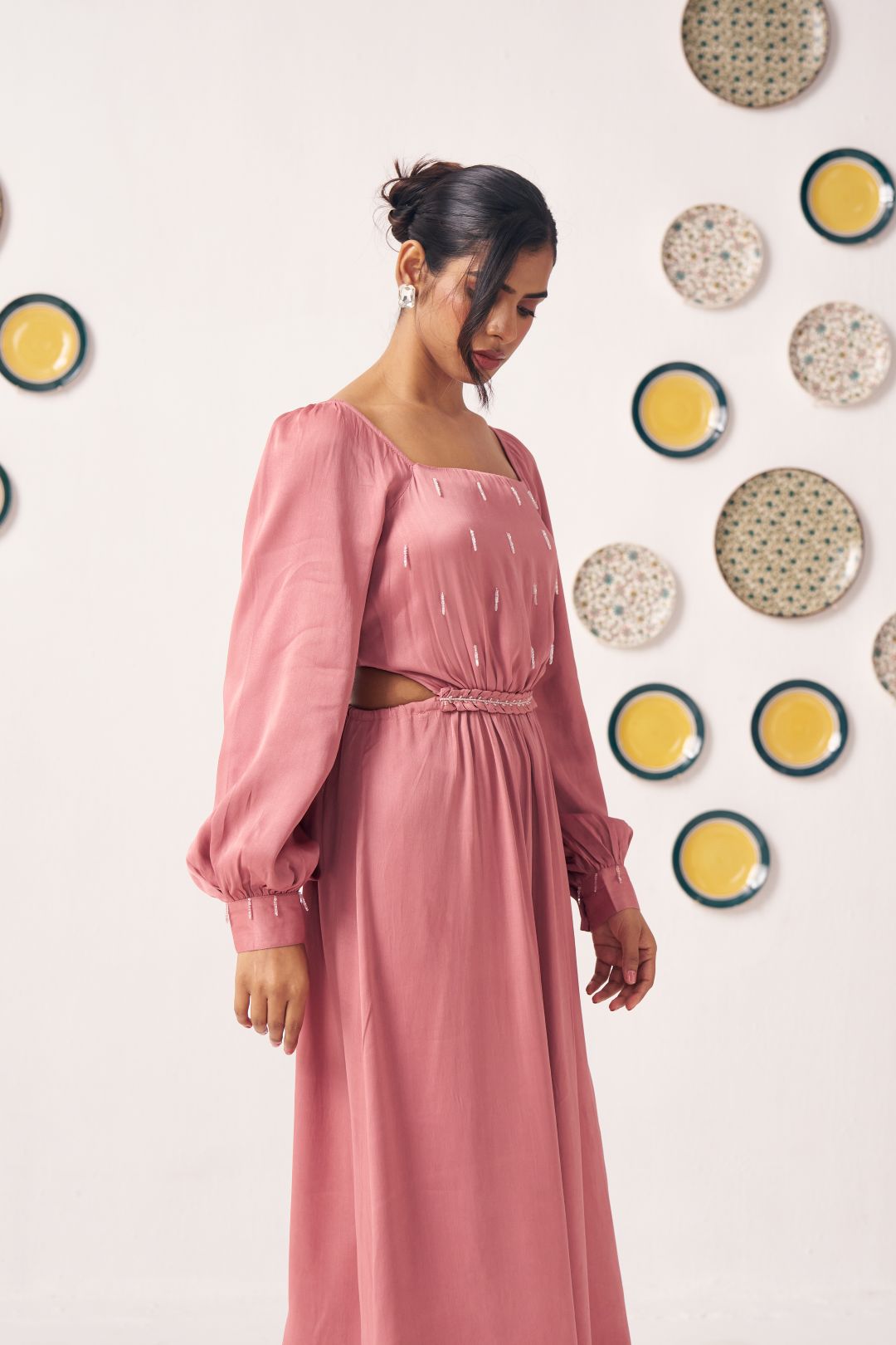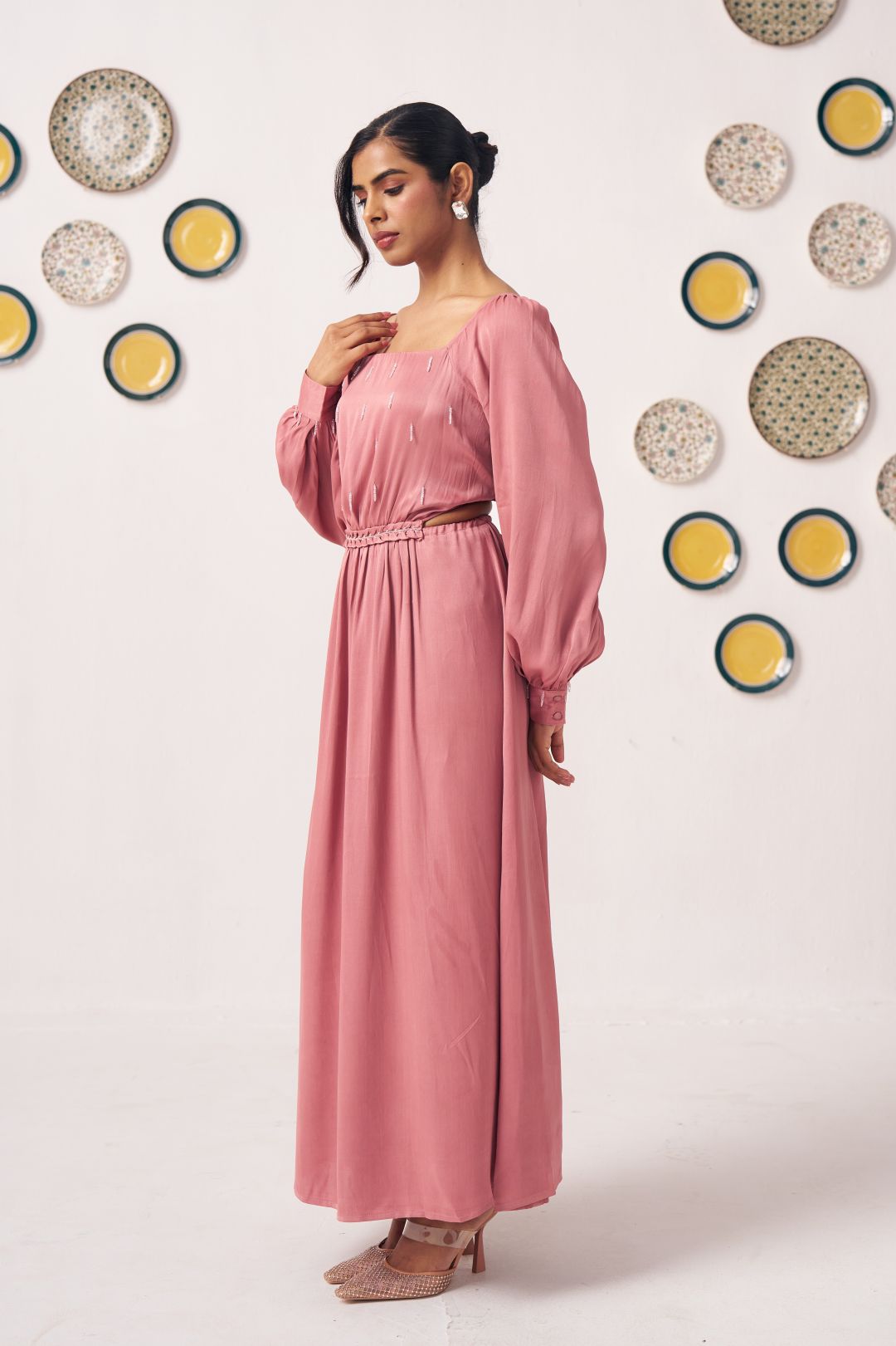 A graceful maxi dress in a soft rose hue, featuring a square neckline and elegant long sleeves. Subtle embroidered accents on the bodice and a gently cinched waist create a flattering, flowing silhouette, perfect for both daytime celebrations and evening occasions.