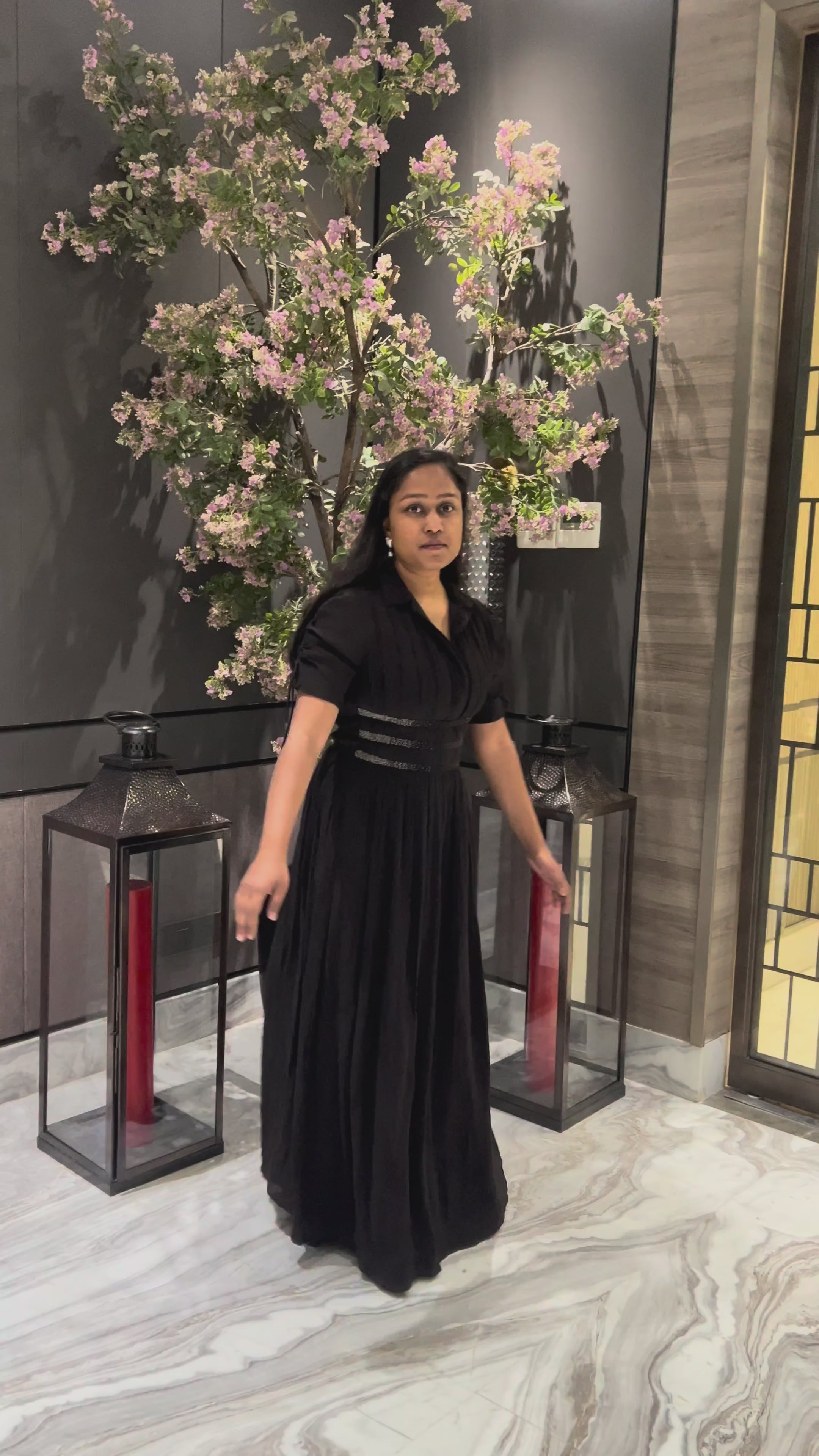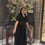 An effortlessly elegant black maxi dress featuring soft pleats and a defined waist that flatters the silhouette. Designed with a structured bodice and flowy fall, this dress is perfect for evening occasions, festive gatherings, or elevated day wear.