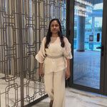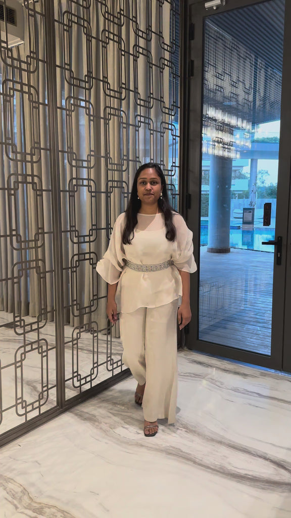 Exude effortless elegance with this ivory co-ord set featuring a sheer, airy top paired with relaxed wide-leg pants. Designed with soft volume sleeves and a delicate embellished belt to define the waist, this lightweight ensemble blends comfort with refined sophistication. Perfect for festive mornings, brunch gatherings, or understated evening occasions.