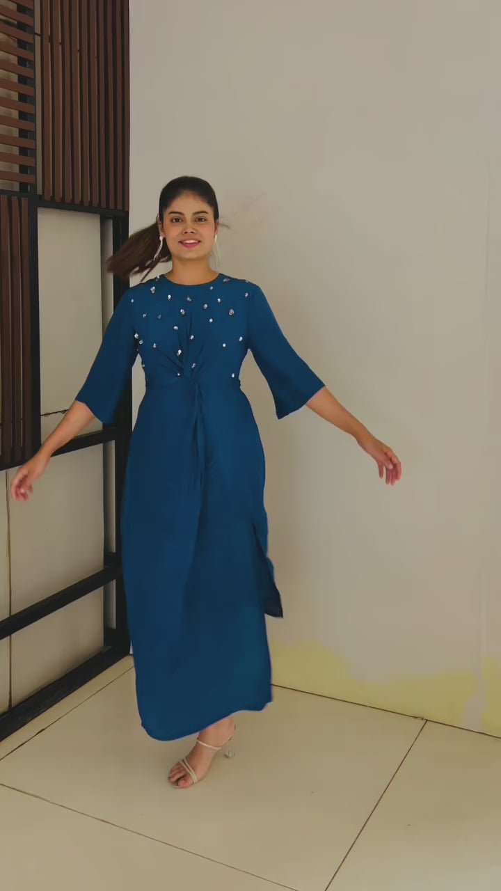 The knot detail midi dress takes you across occasions. From garden soireé to cocktail reception, embellished with our 3d cluster embroidery and a side slit.