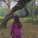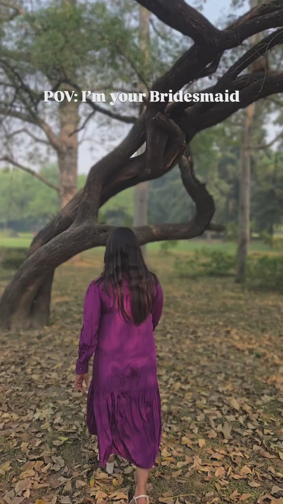 The Evara dress in rich plum viscose crepe is elevated with delicate yoke and shoulder embroidery, enhanced by lace embellishments and fine embroidered buttons. Its graceful detailing and fluid drape create an elegant festive look that blends artisanal charm with contemporary sophistication.