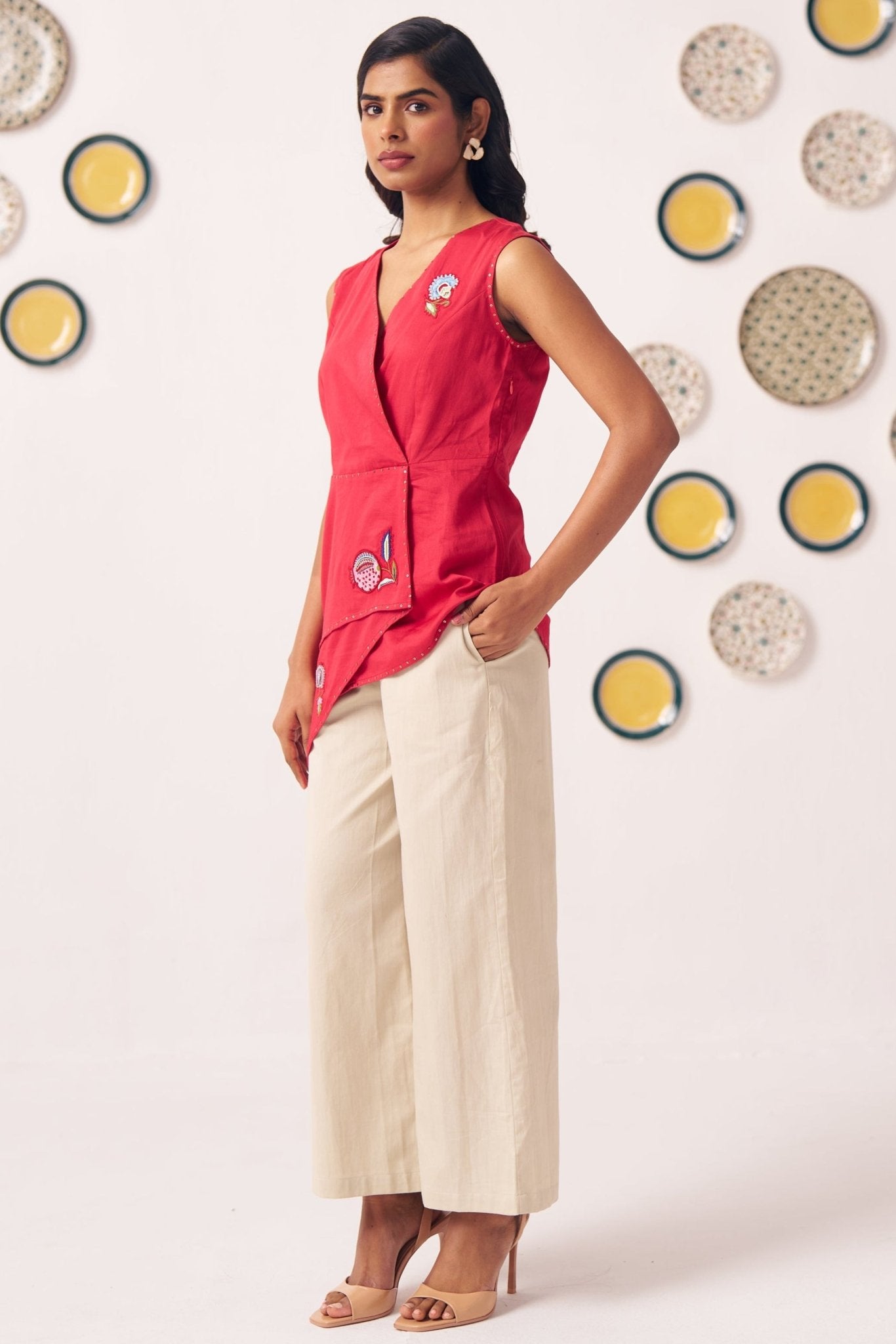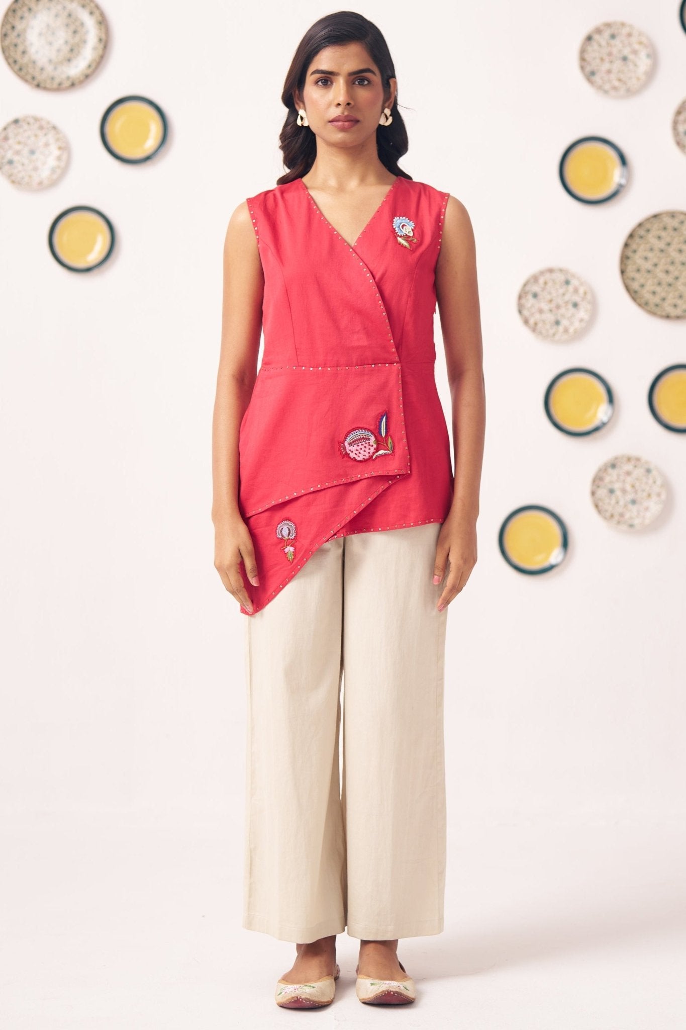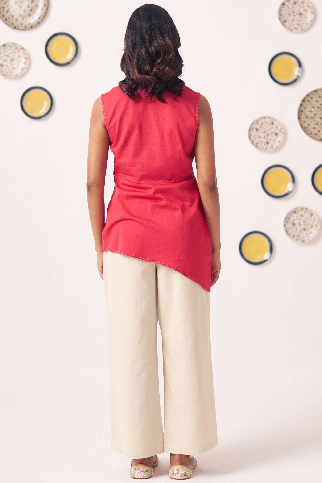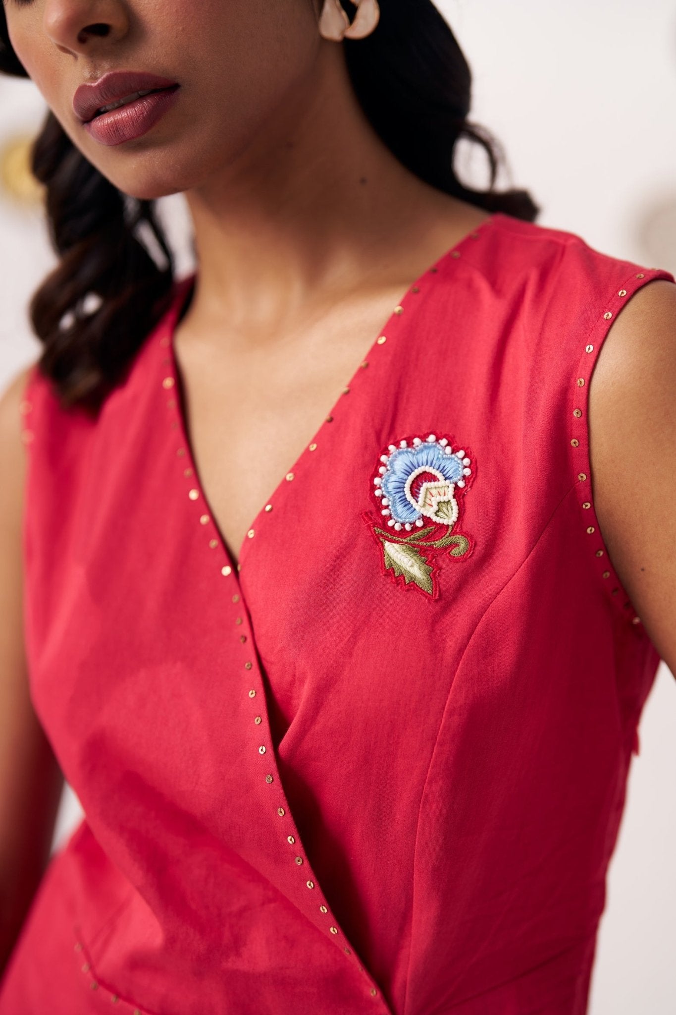 The Reyna sleeveless top, crafted in luxurious gajari red cotton satin, is adorned with delicate hand embroidery and sequin work. Its vibrant hue and intricate detailing create a festive statement, balancing elegance and sparkle—perfectly suited for pairing Subtle Cotton Satin trousers in celebratory occasions.