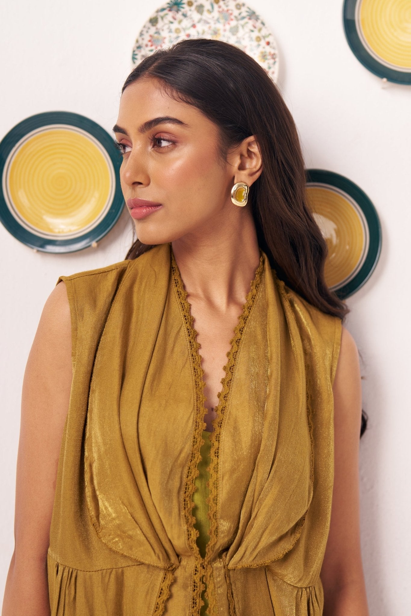 The Viona top features a multi-layered drape silhouette in shimmering cotton lurex, highlighted with delicate lace accents. A festive statement piece that blends fluidity with subtle shine, perfect for celebratory occasions. Pair it with a shimmering brown-gold cotton lurex is tailored with refined pleats at the pocket area, adding subtle structure and festive elegance.
