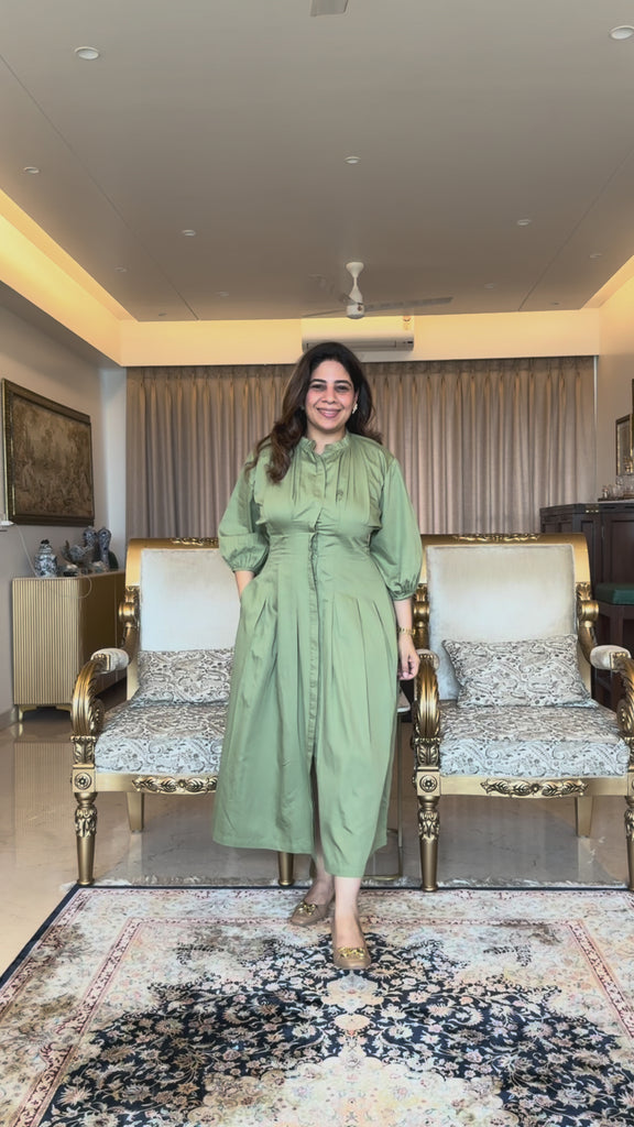 This ‘Kate’ dress is made in the brand’s signature poplin, rendered in an exclusive olive hue. The long midi dress has a fitted longline bodice made with box pleats accentuating the body’s natural curves. Add some mules , a cute handbag and you’re good to go.