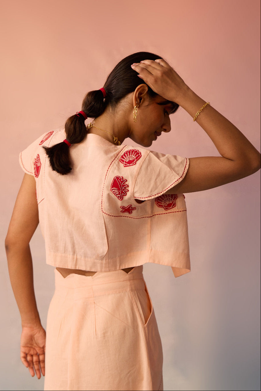 Cotton flax crop jacket with embroidery and top stitch detail
