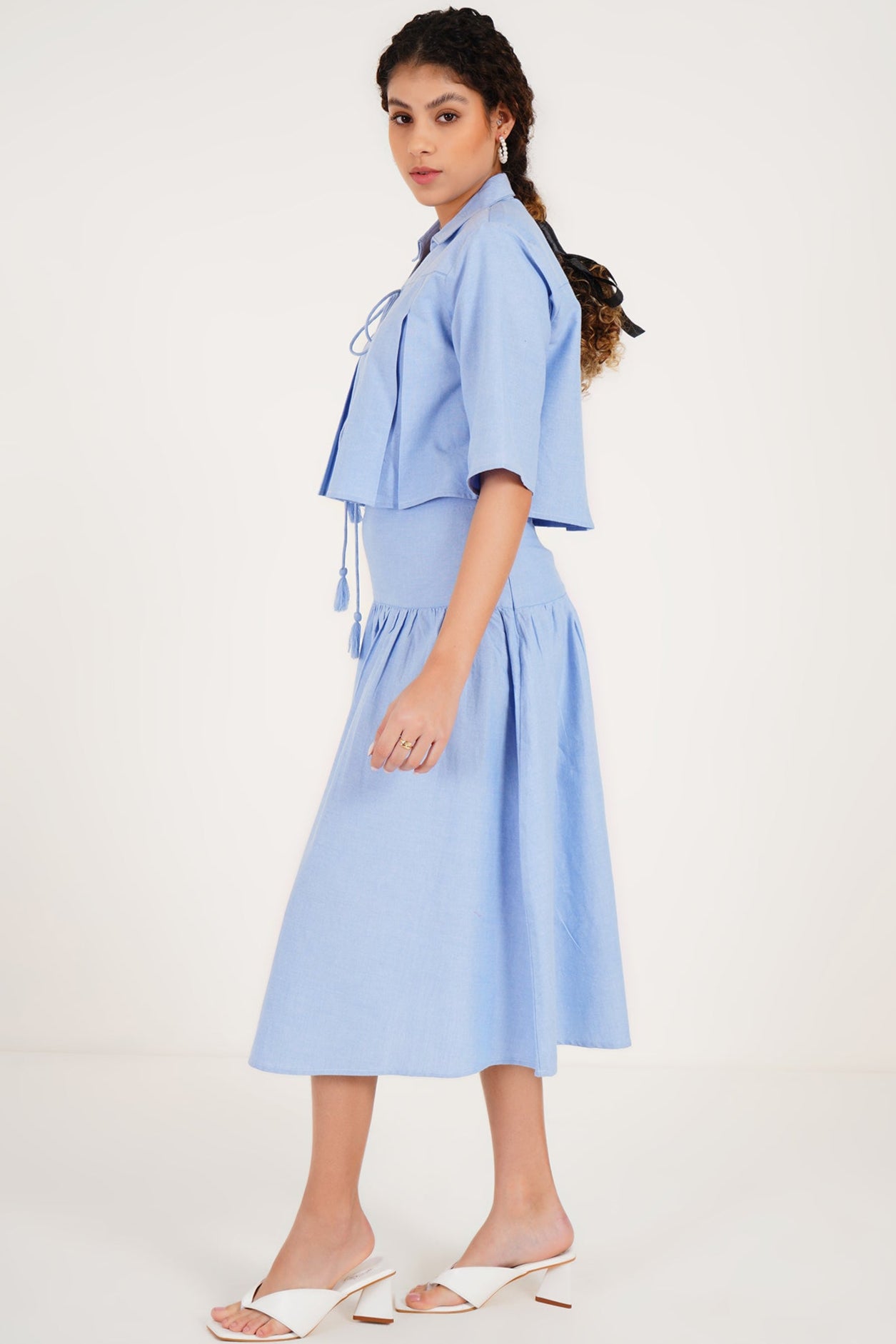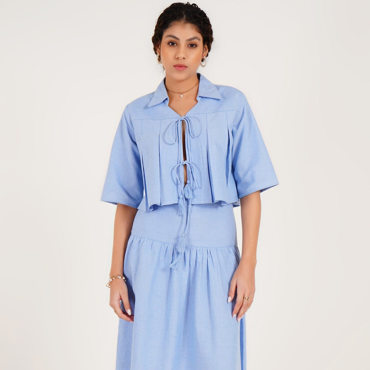 Scalloped Edge Collars Blue Linen Top with Drawstrings