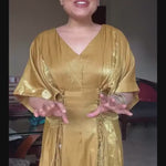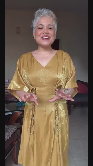 The Vaelora dress in shimmering brown-gold cotton lurex exudes festive radiance with its unique zigzag Dori design on the front. A softly pleated silhouette enhances movement, while playful beaded tassels add artisanal charm—making it a statement piece that beautifully balances tradition and contemporary elegance.